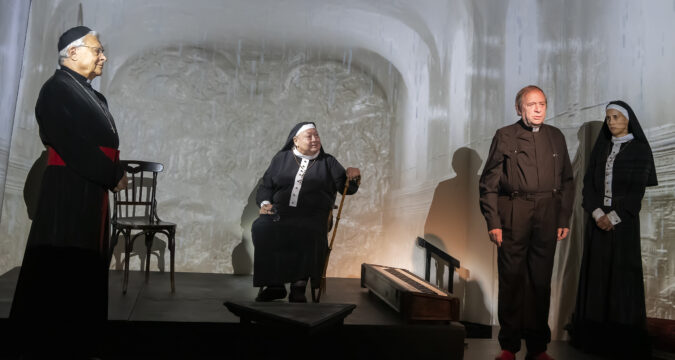 És hogy miért adtam a „Legendák találkozása” alcímet az írásomnak? Vitathatatlan, hogy mind XVI. Benedek, mind Ferenc pápa igazi legendák nem csak a katolikus egyház, de a világ történetében is. És a Szalon színpadán –ehhez méltón- legendás színészek bújnak a szereplők bőrébe. Szeretem a „nagy öregeket” előadásokban látni, minden ilyen pillanatot különlegesnek élek meg. Szerencsésnek érzem magam, hogy láthatom őket játszani, hiszen fantasztikus élmény úgy a már a Nemzet Színészévé választott, Benedeket alakító Jordán Tamás, mind a Ferencet játszó Lukács Sándor karizmatikus jelenléte a világot jelentő deszkákon, nem is beszélve a Brigitta nővért alakító Molnár Piroskáról, aki nemrég még visszavonulásáról beszélt, de –a darab szellemiségéhez kapcsolódóan szólva- hála Istennek, letett erről a tervéről. Vecsei H. Miklós rendező nem csak kiváló történetet, de fantasztikus és lebilincselő színészeket is választott, akik közül kiemelném még a Sophia nővért alakító Trokán Annát. A két nővér, Brigitta és Sophia reakcióján keresztül is kiválóan tetten érhető az egyház élén szükséges változás. Míg Brigitta nővér aggódón tekint Benedek leköszönésére, a fiatal Sophia szeme felcsillan Ferenc pápa érkezése hírére. Külön megemlékezem még Enyvvári Péter díszletéről és az Andristyák Marcell – Vecsei H. Miklós páros által kitalált vetítésekről, melyek nem csak remekül szolgálják és látványossá teszik az előadást, de a Szalonban látható előadások sorából is kiemelik ezt a darabot a látványvilággal és korhű hangulattal.